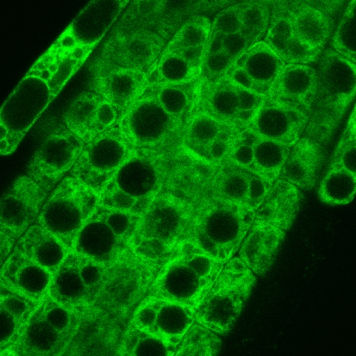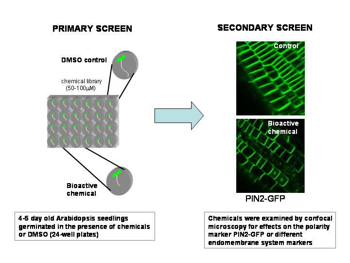 '''PIN2''', 25-50 um chemical (left) compared to DMSO control (right). Results: mislocalization of PIN2-GFP, bigger endosomes