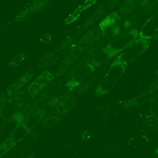 '''Photo1''', 25-50 um chemical (left) compared to DMSO control (right). Results: normal localization of Phototropin1-GFP