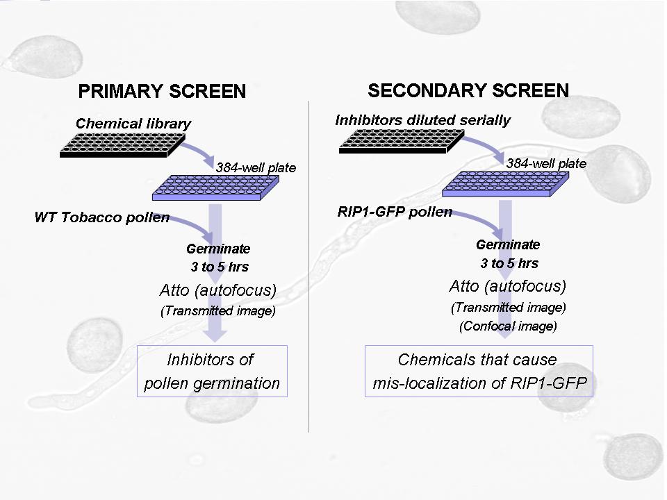 - NOTE RIP1-GFP is mis-localized and the pollen tube tip is swollen (loss of polarity) at concentration between 26uM and 126uM chemical. Tip displays mostly cytosolic localization and tip swelling. Signal at the pollen grain wall is due to autofluorescence.