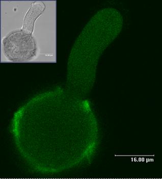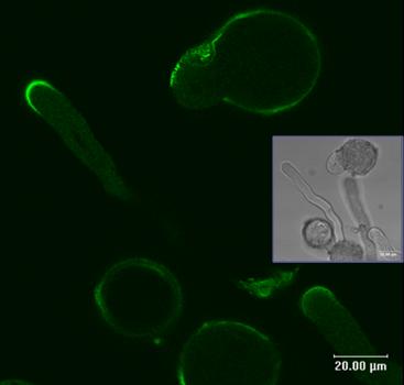- NOTE RIP1-GFP is strongly expressed at the apical plasma membrane of growing pollen tubes. Shown is pollen from a transgenic tobacco line expressing the marker.