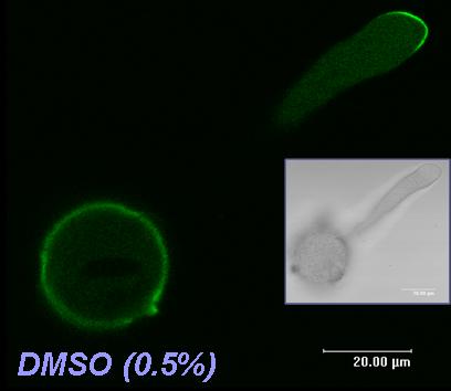 - NOTE Treatment for 2 hours results in the formation of intracellular bodies containing polarity plasma membrane marker PIN2-GFP. Bodies form at a concentration between 26uM and 126uM (left image) which is similar in potency observed in pollen. DMSO control also shown (right image).